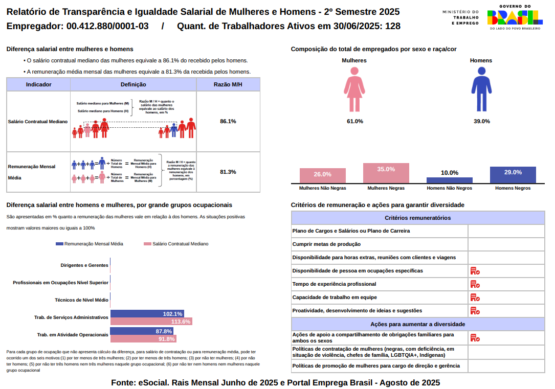 Este relatório tem como objetivo promover a transparência e reforçar o nosso compromisso com a equidade de gênero e a valorização das pessoas em nosso ambiente de trabalho.